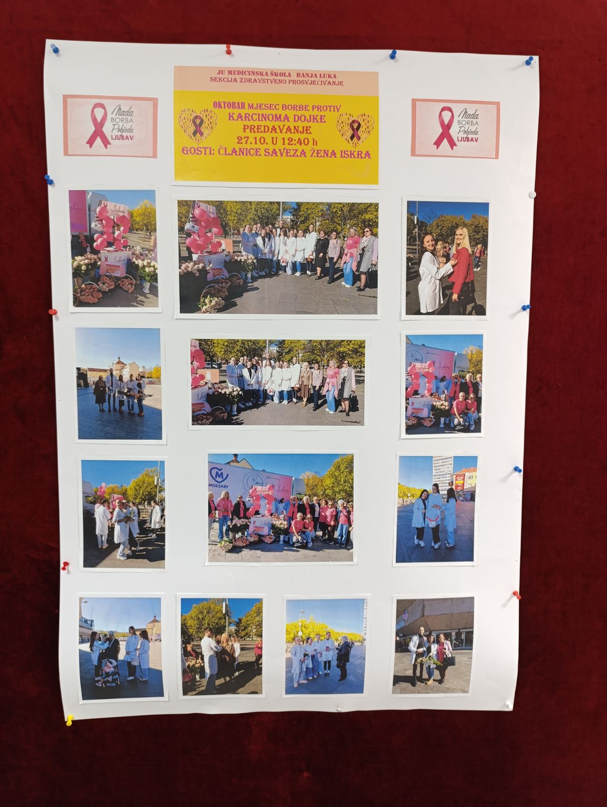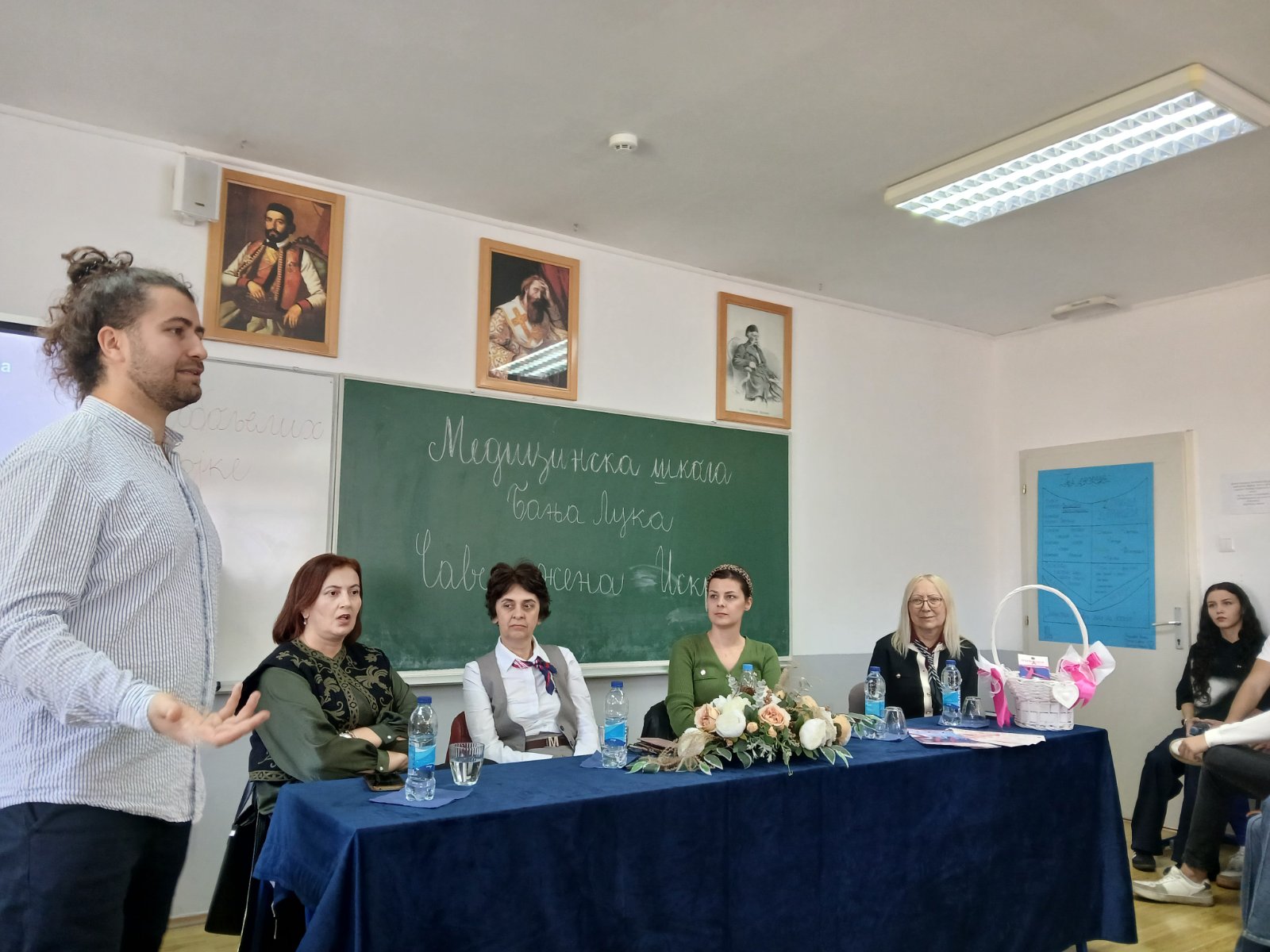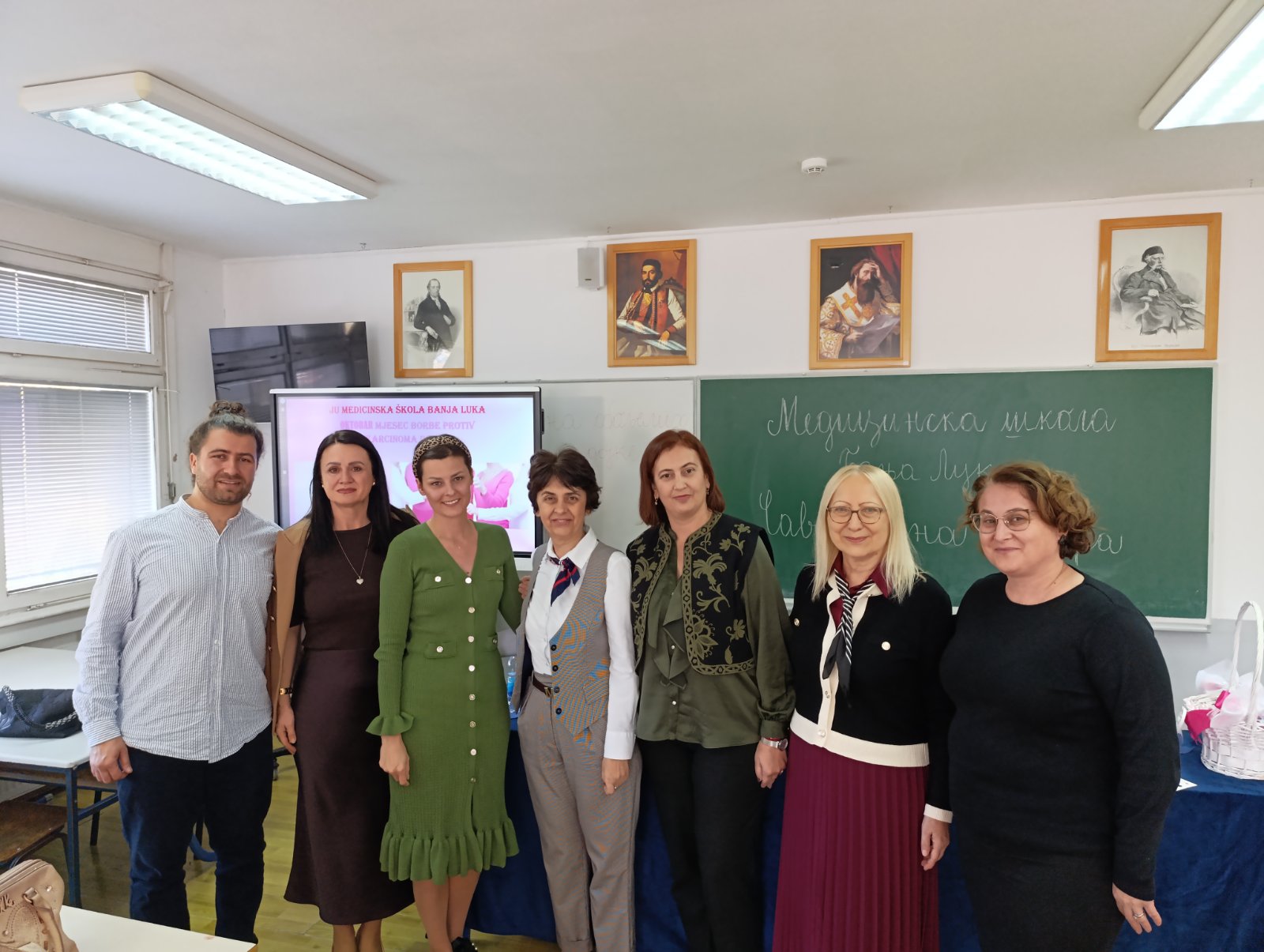 Данас је у Медицинској школи гостовао Савез жена за лијечње карцинома дојке. Гости предавања су били др Обрен Томић који је одржао предавање на тему важности превентивних прегледа дојки, и чланице Савеза Верица Тадић, Миландинка Марчета и Александра Ромић које су говориле о својој борби са овом болешћу. Предавању је присуствовало 68 ученика трећих и четвртих разреда, 6 професора и педагог школе. Захваљујемо се чланицама Искре што су са нама подијелиле својa лична искуства на врло емотиван начин који је пробудио емпатије код ученика и што су помогле да подигнемо свијест ученика о значају превенције карцинома дојке.